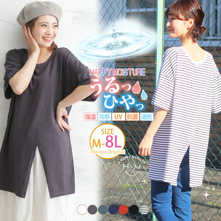 【全品10%オフクーポン5/6 9:59まで】 大きいサイズ レディース チュニック | ハッピーモイスチャー 夏の至福の カットソー 前後2way アシンメトリー スリット チュニック _ オリジナル トップス LL 3L 4L 5L 6L 7L 8L 夏 接触冷感 吸水速乾 保湿 [468014] 【メール便可】
