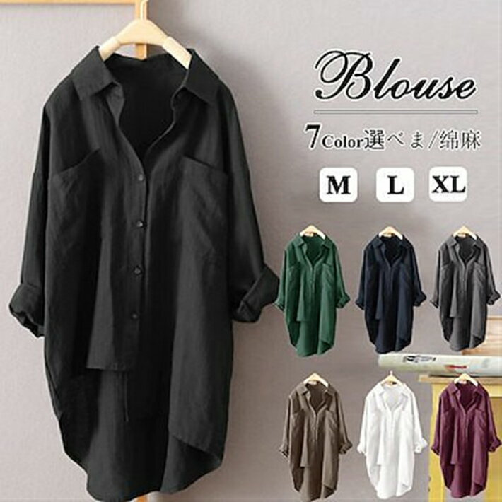 送料無料 シャツ ブラウス レディース 無地シャツ ブラウスロング丈 チュニック 大きいサイズ 長袖 春 秋 ゆったり 綿麻 ホワイト レッド ブラック グレー グリーン ブルー カーキ S M L XL XXL XXXL XXXXL