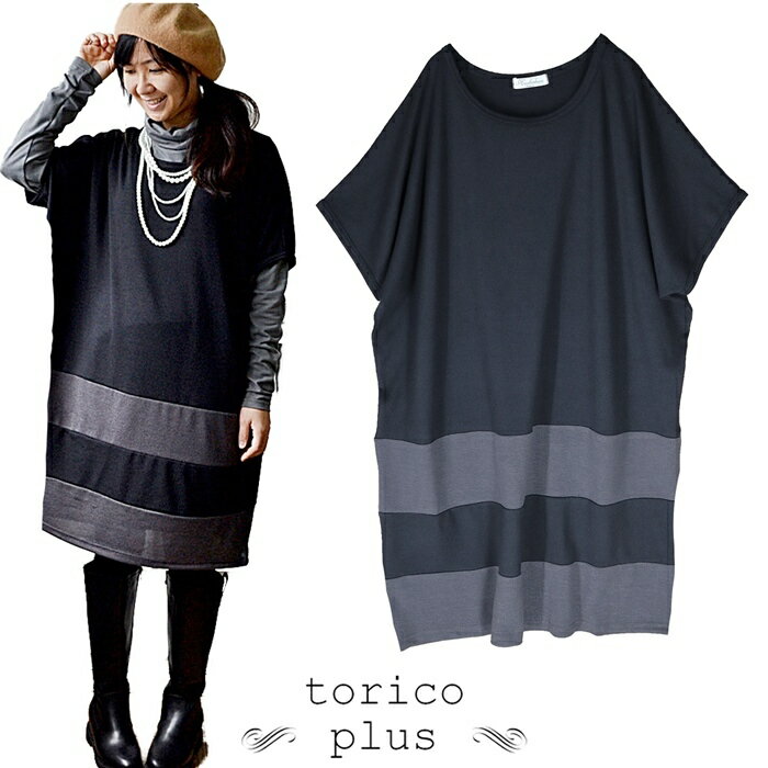 大きいサイズ チュニック ワンピー 春 ボーダー 配色 オーバーサイズでゆるっと着れる かわいい チュニック ワンピース ドルマン バイカラー レディース ワンピース 切り替え 配色 メール便【送料無料】黒×チャコールグレー